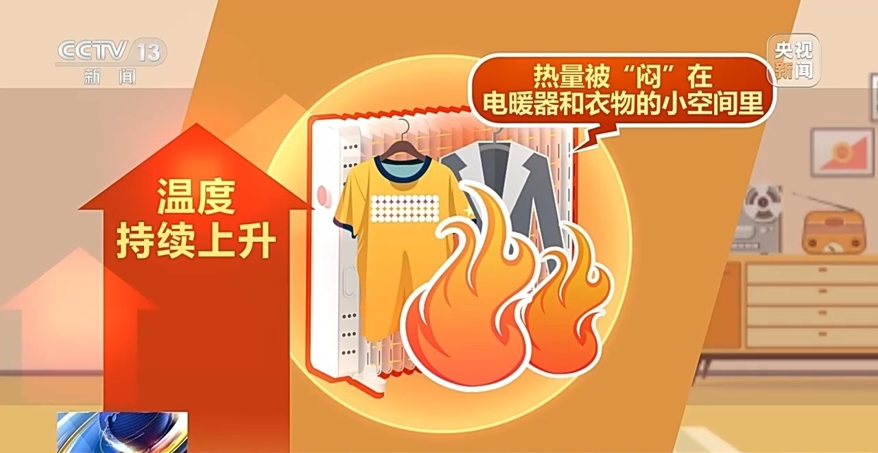 很多人喜歡把衣物放在電暖氣上烤,這是有風(fēng)險的!因?yàn)檫@樣會導(dǎo)致熱量被“悶”在電暖器和衣物的小空間里,形成一個“小烤箱”溫度持續(xù)上升,可能引燃衣物導(dǎo)致火災(zāi)。