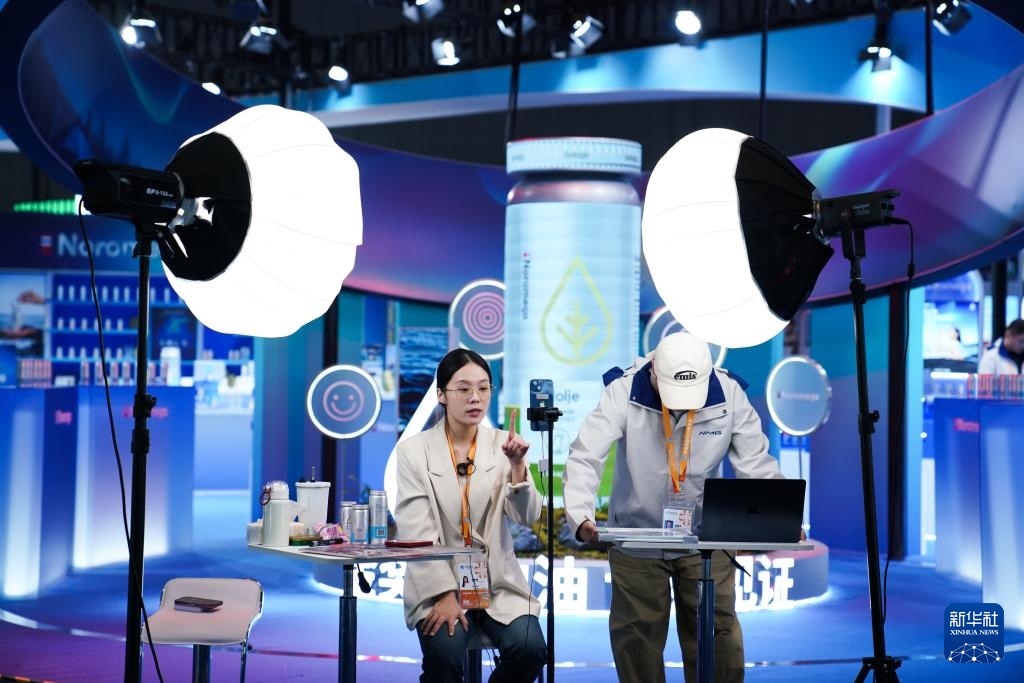 11月4日,工作人員在第八屆進(jìn)博會(huì)醫(yī)療器械及醫(yī)藥保健展區(qū)直播。