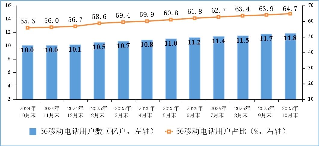 移動電話用戶規(guī)模穩(wěn)中有增,5G用戶數(shù)持續(xù)增加。截至10月末,三家基礎電信企業(yè)及中國廣電的移動電話用戶總數(shù)達18.3億戶,比上年末凈增4015萬戶。其中,5G移動電話用戶達11.84億戶,比上年末凈增1.7億戶,占移動電話用戶的64.7%。