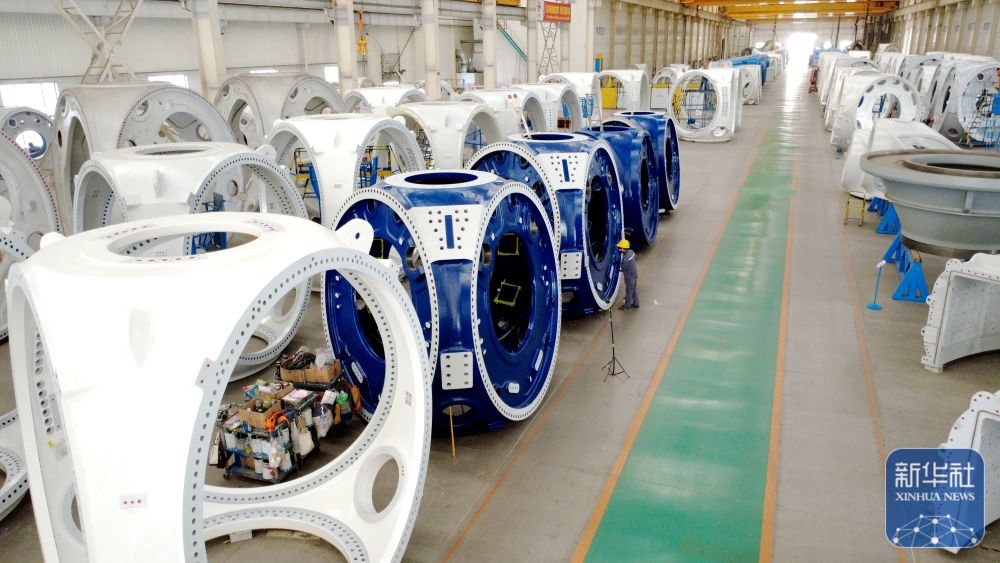 ↑ 12月15日,工人在山東省濱州市惠民經(jīng)濟(jì)開(kāi)發(fā)區(qū)風(fēng)電裝備產(chǎn)業(yè)園的車間清理風(fēng)電輪轂(無(wú)人機(jī)照片)。新華社發(fā)(王軍攝)