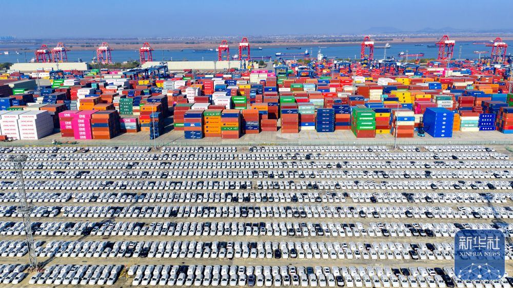 ↑ 12月14日在江蘇省港口集團(tuán)南京港龍?zhí)都b箱碼頭拍攝的等待裝船出口的國(guó)產(chǎn)汽車(無(wú)人機(jī)照片)。新華社發(fā)(楊素平攝)
