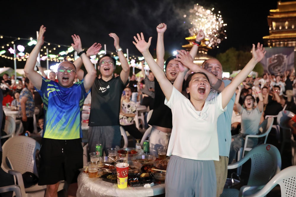 7月20日,球迷在淮安市漕運(yùn)門廣場觀看“蘇超”淮安隊(duì)對陣無錫隊(duì)的比賽。新華社發(fā)(徐昌政 攝)