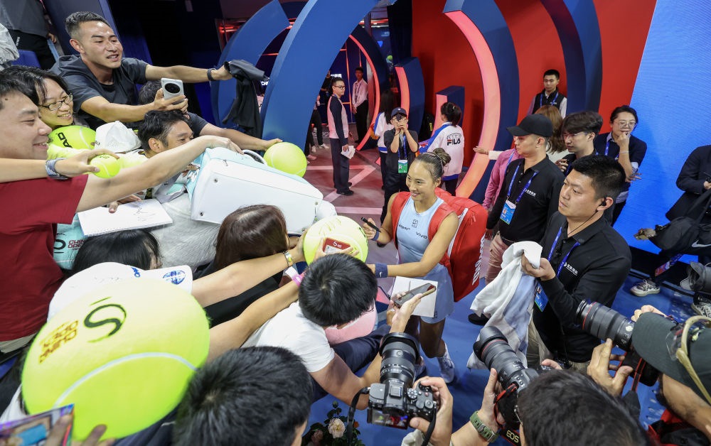 9月27日,在北京舉行的2025中國網(wǎng)球公開賽女單第二輪與哥倫比亞選手阿朗戈的比賽后,中國選手鄭欽文(中)與觀眾互動(dòng)。新華社記者 白雪飛 攝
