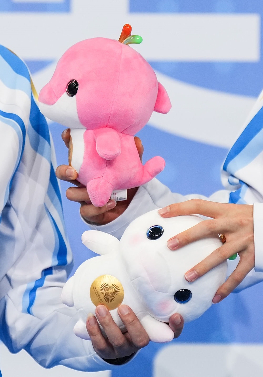 11月14日,第十五屆全國運(yùn)動(dòng)會游泳男子100米自由泳決賽在廣東省深圳市舉行,圖為冠軍浙江隊(duì)選手潘展樂和教練在頒獎(jiǎng)儀式上交換吉祥物。新華社記者 薛宇舸 攝