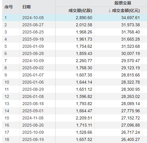 據(jù)Wind統(tǒng)計,A股成交額突破3萬億元此前總共發(fā)生了6次,分別是2024年10月8日,2025年8月25日、8月27日、8月28日和9月18日,2026年1月9日。