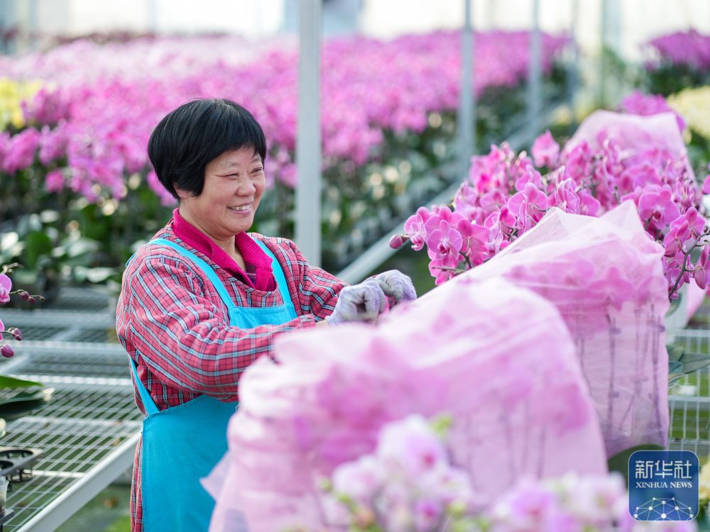 ↑1月23日,花卉工人在江蘇省泰州市姜堰區(qū)顧高鎮(zhèn)現(xiàn)代園藝產(chǎn)業(yè)園基地為花做造型,準備供應(yīng)節(jié)日市場。新華社發(fā)(周社根攝)