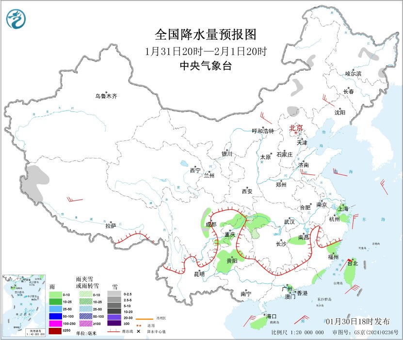 受冷暖空氣共同影響,30日夜間至31日,江漢西部、江淮、江南東北部和西北部及貴州東北部等地有小到中雪或雨夾雪,安徽南部和湖南西部等地局地有大雪,高海拔山區(qū)局地有凍雨;西南地區(qū)東部、江南、華南等地有小到中雨。