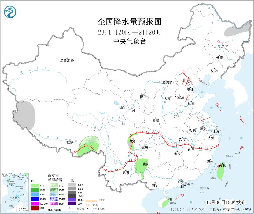 1月30日20時至31日20時,內(nèi)蒙古中東部、新疆南疆西部山區(qū)、西藏西部、青海北部和東部、川西高原北部、甘肅河西和南部、黑龍江北部、遼寧中南部、江淮中東部、江漢西部及湖南西部、貴州東北部等地部分地區(qū)有小雪或雨夾雪,其中,新疆南疆西部山區(qū)、安徽南部、湖南西部、貴州東北部等地部分地區(qū)有中到大雪(5~9毫米);貴州西部和東南部、湖南南部等地高海拔山區(qū)局地有凍雨。江淮西部、江南大部、西南地區(qū)東部、華南大部、臺灣島等地部分地區(qū)有小雨,其中,江西東北部、浙江中北部等地部分地區(qū)有中雨。內(nèi)蒙古中東部、遼東半島、山東半島等地部分地區(qū)有4~5級風(fēng);東海南部海域、臺灣海峽、臺灣以東洋面、巴士海峽、南海東北部海域?qū)⒂?~7級風(fēng)、陣風(fēng)8級(見圖1)。