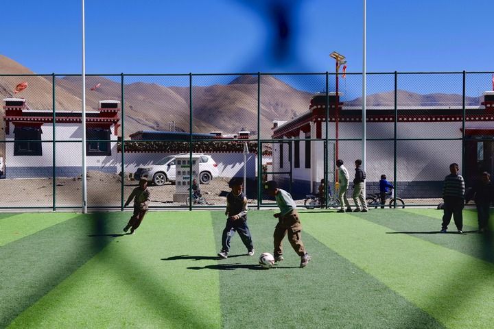 這是孩子們?cè)陂L(zhǎng)所鄉(xiāng)森嘎村的足球場(chǎng)上踢球。新華每日電訊記者 周昱龍 攝