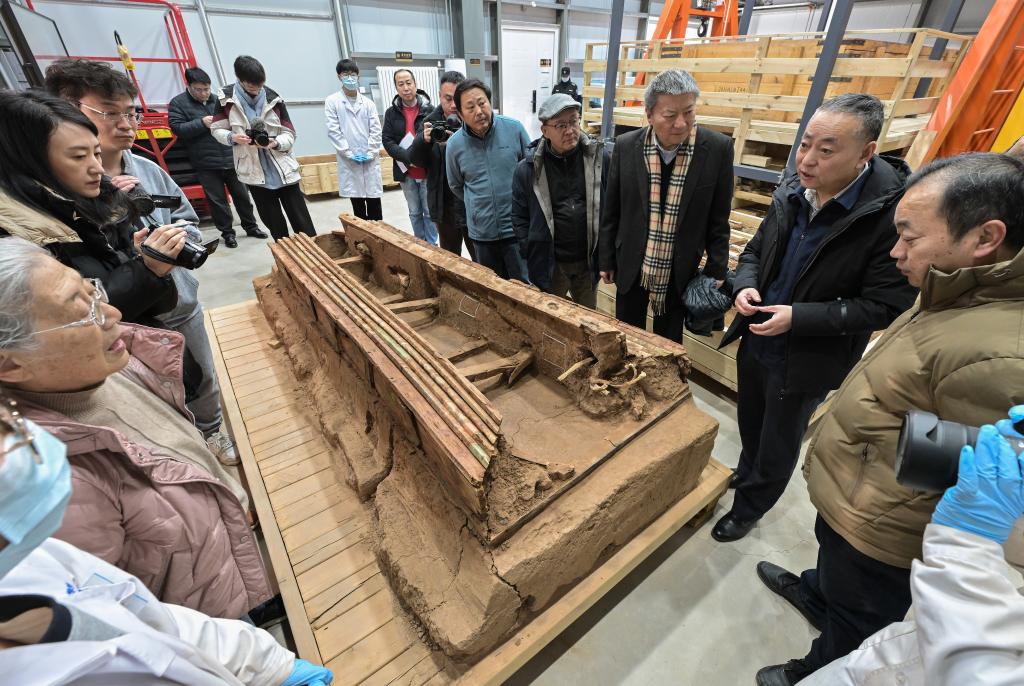 巴達木東晉唐時期墓群考古發(fā)掘負責人尚玉平(右二)向?qū)<覀兘榻B墓葬M20出土的彩繪木棺座。新華社記者 李賀 攝