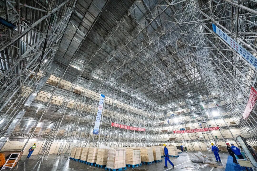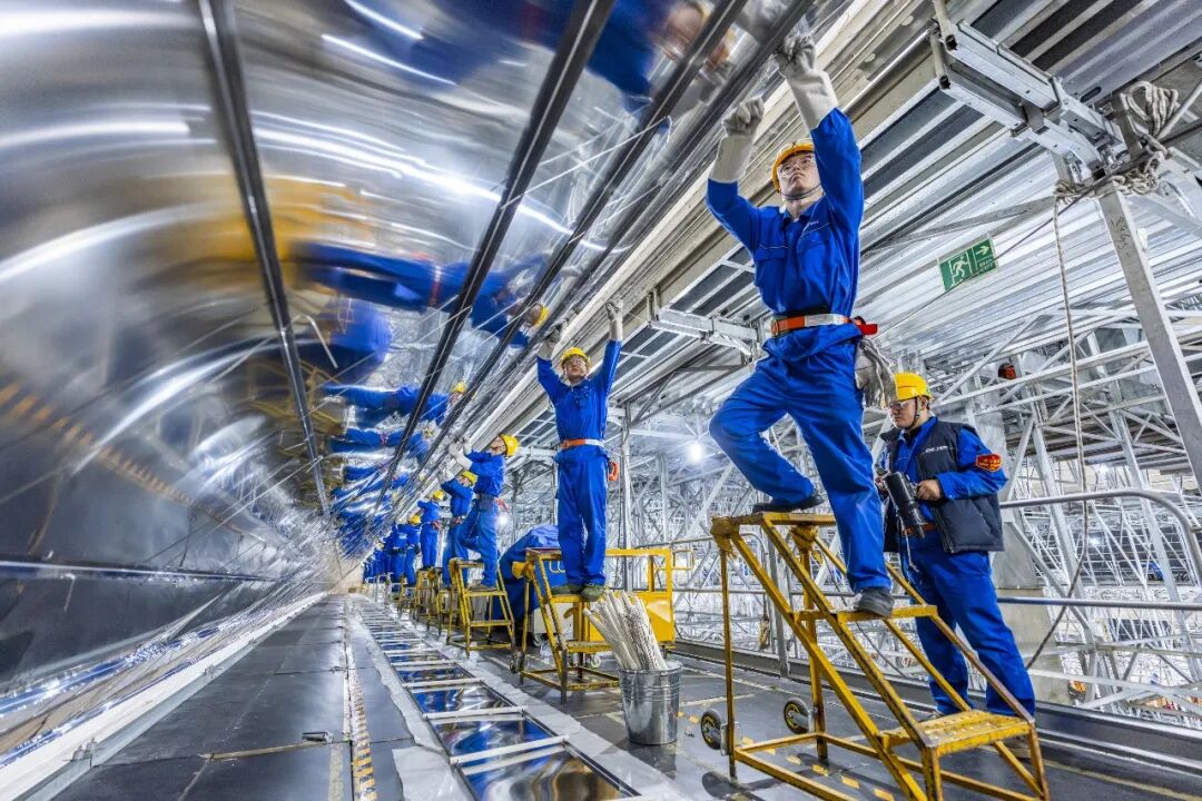 2026年4月1日,一艘大型LNG船液貨艙內(nèi)十幾名工人同時安裝一塊40多米長的殷瓦列板。攝影 萬全/人民畫報