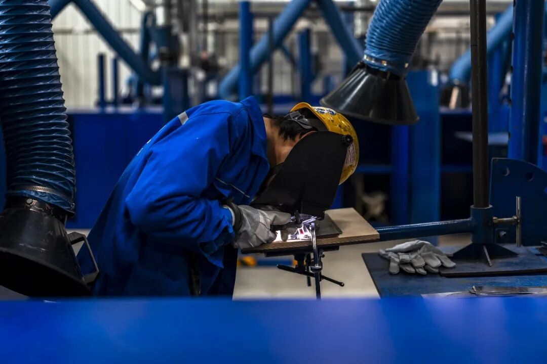 2026年4月1日,滬東中華造船殷瓦鋼焊接培訓(xùn)車間內(nèi),新入職的工人正在苦練殷瓦鋼焊接技藝。攝影 徐訊/人民畫報