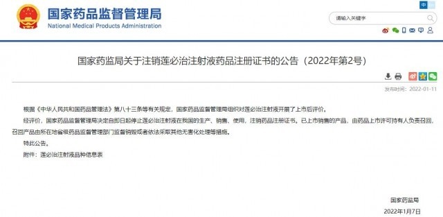 據(jù)國家藥監(jiān)局網(wǎng)站消息,國家藥品監(jiān)督管理局11日發(fā)布公告,決定自即日起停止蓮必治注射液在我國的生產(chǎn)、銷售、使用,注銷藥品注冊(cè)證書。已上市銷售的產(chǎn)品,由藥品上市許可持有人負(fù)責(zé)召回,召回產(chǎn)品由所在地省級(jí)藥品監(jiān)督管理部門監(jiān)督銷毀或者依法采取其他無害化處理等措施。