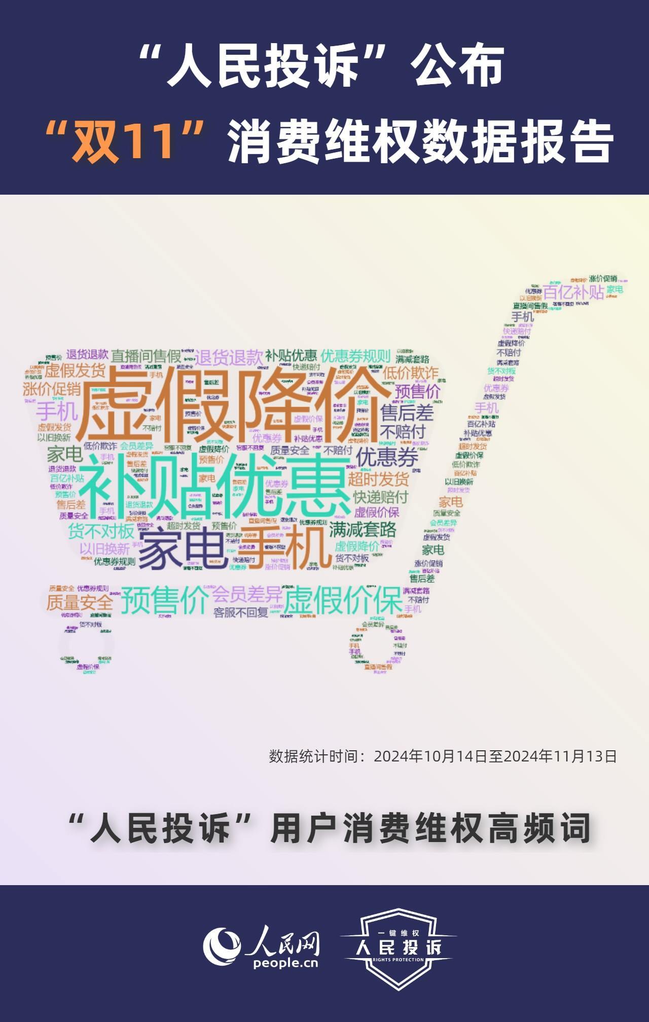 那么,今年你的“雙11”購物還遇到了哪些“套路”?據(jù)人民網(wǎng)“人民投訴”平臺統(tǒng)計,“雙11”期間平臺共收到17699條(數(shù)據(jù)統(tǒng)計從2024年10月14日-11月13日)投訴信息。其中,手機、家電、智能產(chǎn)品、美妝服飾等消費領域維權(quán)量大;平臺“國補”“以舊換新”等優(yōu)惠規(guī)則不透明,保價服務藏“貓膩”,直播間虛假“破價”,“百億補貼”商品貨不對板,“高價預售”欺詐等問題反映突出。