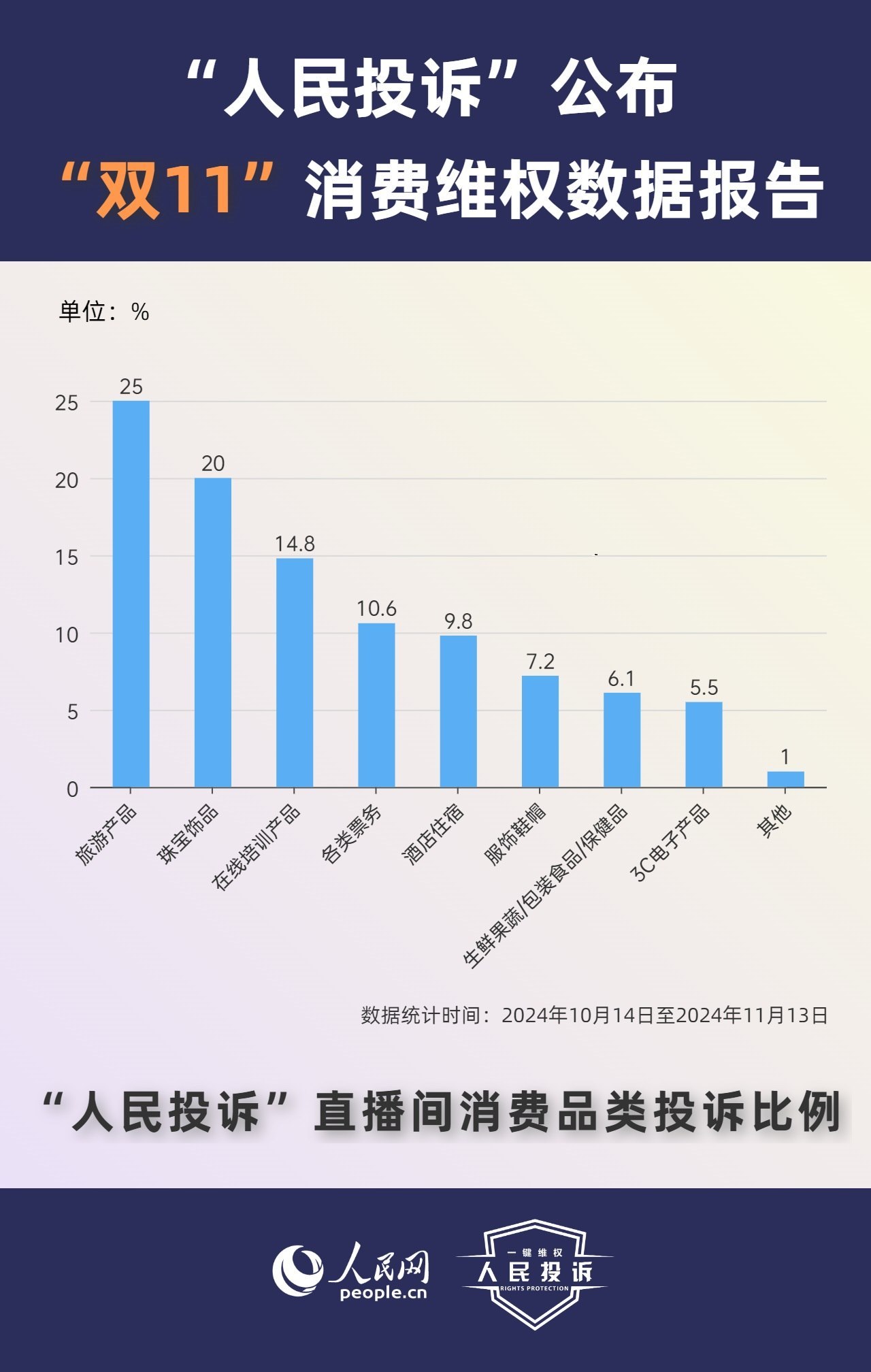 今年“雙11”前夕,人民網(wǎng)“人民投訴”平臺聯(lián)合人民日報“讀者來信”版發(fā)起規(guī)范“直播帶貨”問題建議征集活動。平臺數(shù)據(jù)顯示,活動上線以來,網(wǎng)友通過各渠道的相關(guān)留言量已超千條?!叭嗣裢对V”分析發(fā)現(xiàn),網(wǎng)友投訴直播消費多集中在預付費式旅游產(chǎn)品、在線培訓產(chǎn)品、珠寶飾品、服裝鞋帽、電子產(chǎn)品、生鮮食品、酒店服務、娛樂演出票務、寵物買賣等消費品類。其中,旅游套餐投訴占比25%,珠寶飾品交易投訴占比20%,在線培訓投訴占比14.8%,各類票務投訴占比10.6%,酒店住宿投訴占比9.8%,服飾帽類商品投訴占比7.2%,生鮮果蔬/包裝食品/保健品投訴占比6.1%,3C電子產(chǎn)品投訴占比5.5%。