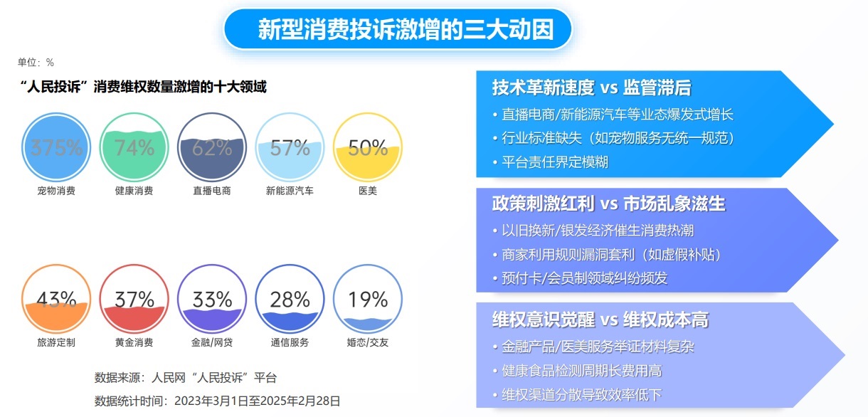 “人民投訴”綜合分析,技術驅動新業(yè)態(tài)與監(jiān)管未能同步、政策刺激紅利與市場亂象并存、維權意識提升與維權成本矛盾這三大因素共同成為推高新型消費領域風險的原因。