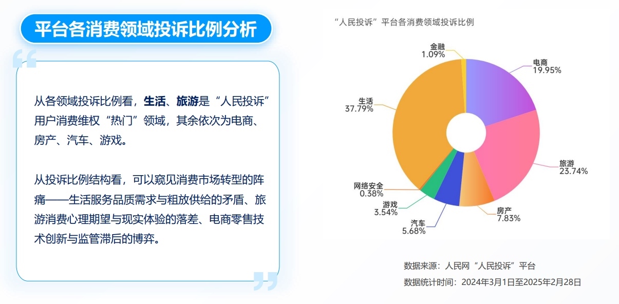 2024年3月1日至2025年2月28日,“人民投訴”用戶投訴量同比增加109%。入駐企業(yè)/機構回復辦理平臺投訴近3000件。特別是旅游在線平臺、電商平臺、3C家電、定制家居、新能源汽車、網(wǎng)貸保險、快遞、游戲娛樂、票務、通信服務等消費領域的企業(yè)/機構回復/辦理投訴較積極,用戶滿意度提升,平臺在線糾紛解決機制成效顯現(xiàn)。