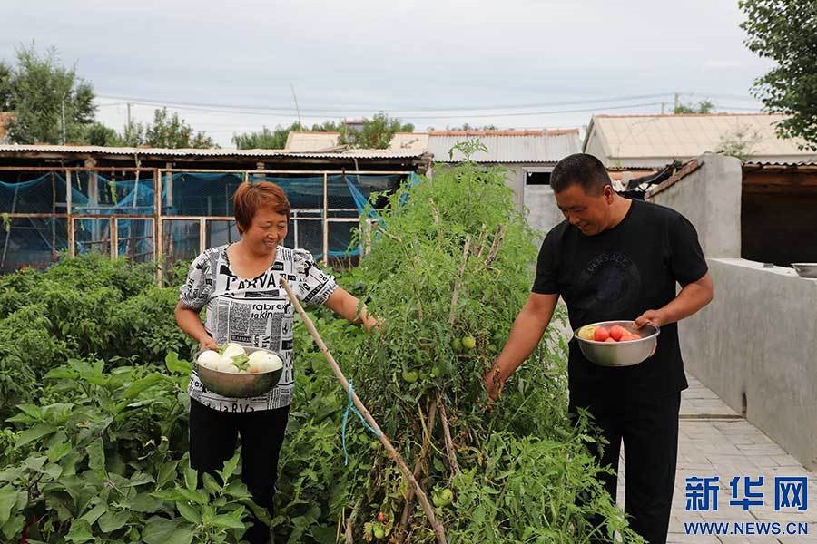 姜玉龍、宋朋艷夫婦在菜園中收獲勞動(dòng)果實(shí)。新華網(wǎng)發(fā)