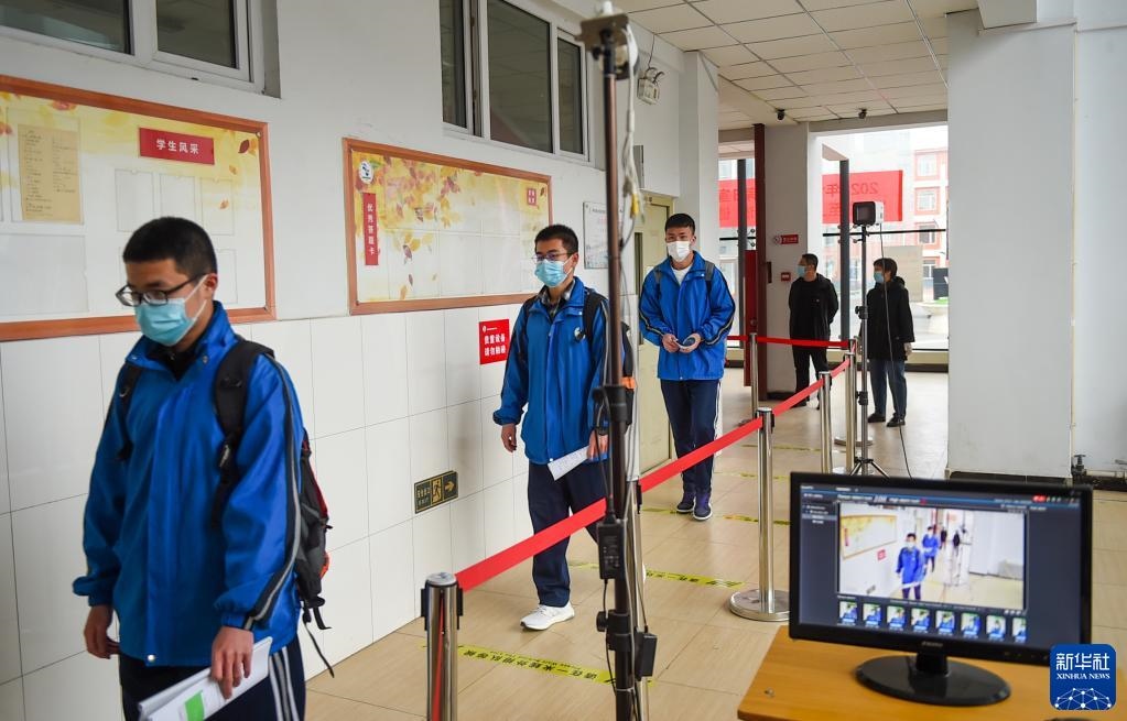 4月1日,高三年級(jí)學(xué)生走進(jìn)呼和浩特市鐵路第二中學(xué)教學(xué)樓,體溫檢測(cè)設(shè)備查驗(yàn)學(xué)生體溫。