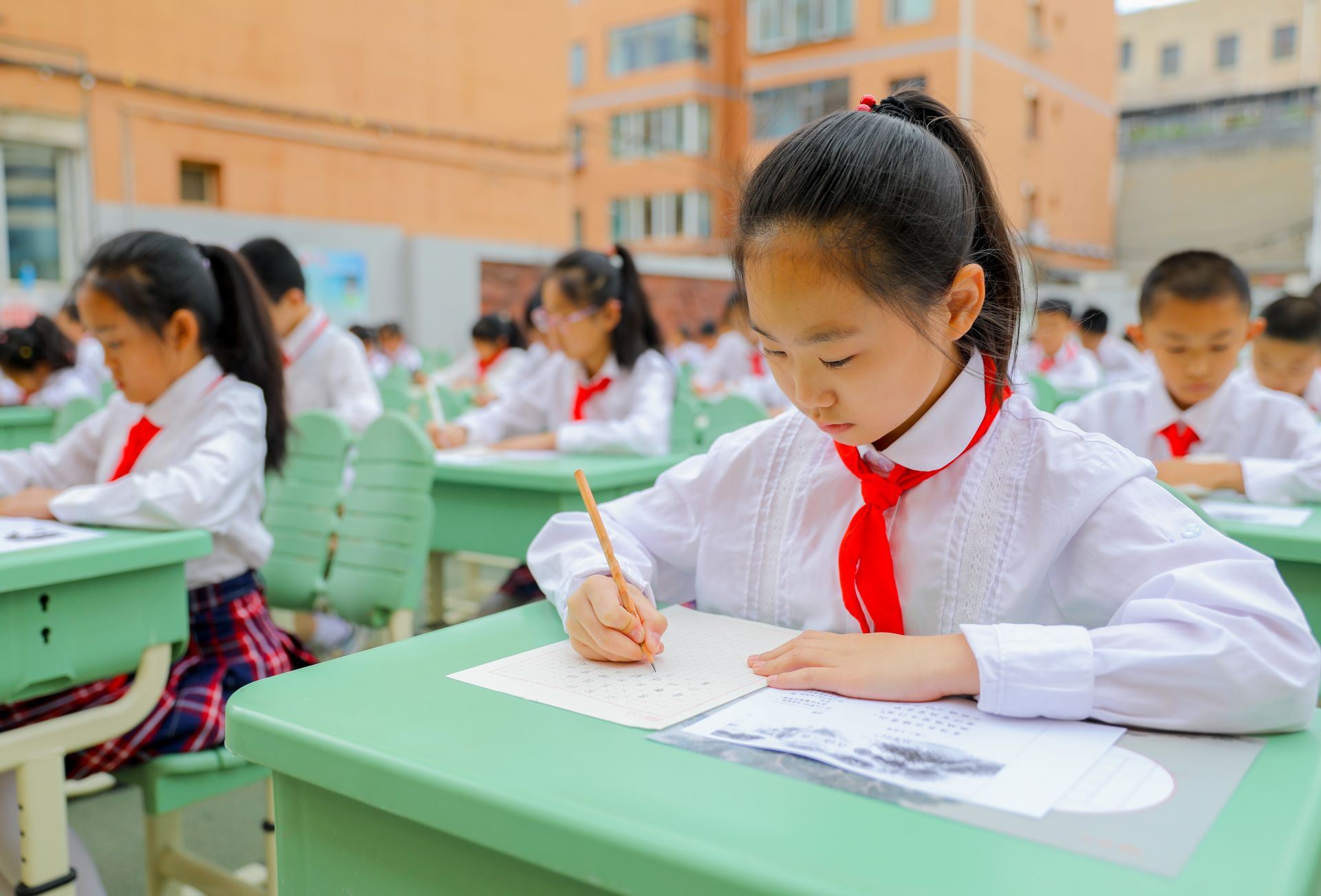 6月13日,呼和浩特市玉泉區(qū)恒昌店巷小學(xué)的學(xué)生們正在參加書(shū)法比賽。當(dāng)日,該?!靶@書(shū)法文化節(jié)”漢字書(shū)寫大賽開(kāi)賽,200多名學(xué)生在硬筆和軟筆項(xiàng)目上展開(kāi)比拼?;顒?dòng)旨在提高孩子們漢字書(shū)寫水平,弘揚(yáng)中華民族優(yōu)秀傳統(tǒng)文化。