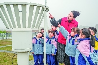 浙江長(zhǎng)興國(guó)家氣象觀測(cè)站,科普志愿者向龍山街道中心幼兒園的孩子介紹氣象知識(shí)。新華社發(fā)