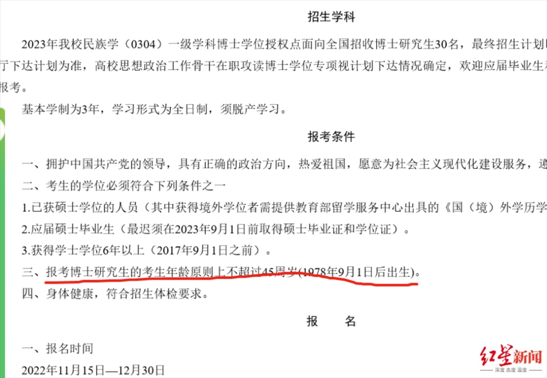 而根據(jù)《青海民族大學(xué)2023年民族學(xué)博士研究生招生簡章》,報(bào)考博士研究生的考生年齡原則上不超過45周歲(1978年9月1日后出生)。資料顯示,阿進(jìn)錄為1973年出生。對(duì)于網(wǎng)友提到的“年齡不符合報(bào)考條件”,上述工作人員表示:“他資格審查是通過的。”