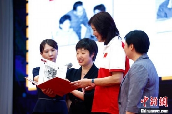 圖為郎平向陳經(jīng)綸中學(xué)贈送紀念品。中新社記者 富田 攝