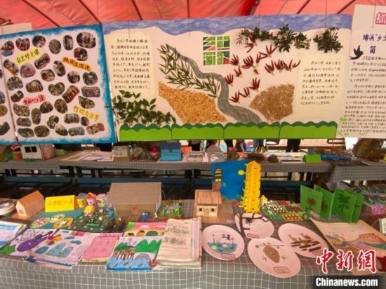 本次活動展出作品近700件,作品涵蓋圖繪、泥塑、詩歌、立體卡紙、多種鄉(xiāng)土材料的立體及平面作品創(chuàng)作、自制故事繪本等多種形式,作品內容涉及家譜、家鄉(xiāng)地形、家鄉(xiāng)動植物、家鄉(xiāng)美食、家鄉(xiāng)名人、家鄉(xiāng)建筑等鄉(xiāng)土文化主題。這些作品在創(chuàng)作過程中并沒有經過老師們的干預,都是鄉(xiāng)村兒童在觀察體驗自己身邊的鄉(xiāng)土資源與文化后進行的自主創(chuàng)作。