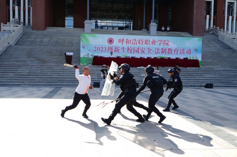 5500余名新生在軍訓場上,英姿颯爽朝氣蓬勃,呼和浩特市公安局反恐怖和特巡警支隊教官團隊,通過現(xiàn)場授課及實操演練相結合的方式進行了處突紅藍對抗演練(紅方為反恐怖和特巡警支隊民警,藍方為由反恐怖和特巡警支隊民警扮演的恐怖分子),指導學生在遇到危險情況下如何應對。進一步增強大學生的安全防范意識和自我保護能力。