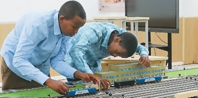 在位于吉布提首都吉布提市的吉布提工商學(xué)校,學(xué)生在魯班工坊鐵道運(yùn)營沙盤教學(xué)區(qū)學(xué)習(xí)。 新華社發(fā) |