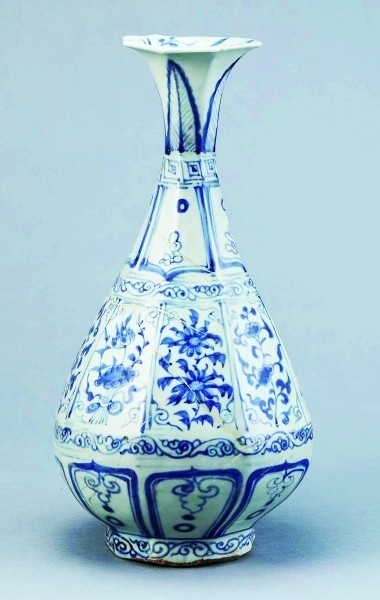 “北京大學(xué)藏古代外銷瓷”特展上的展品景德鎮(zhèn)窯青花折枝花卉紋八方玉壺春瓶。資料圖片