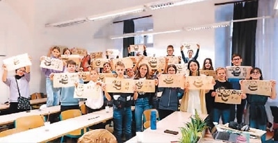 匈牙利羅蘭大學(xué)孔子學(xué)院下設(shè)埃格爾教學(xué)點(diǎn)多博·伊什特萬(wàn)中學(xué)中文課堂的學(xué)生們展示繪畫(huà)作品。