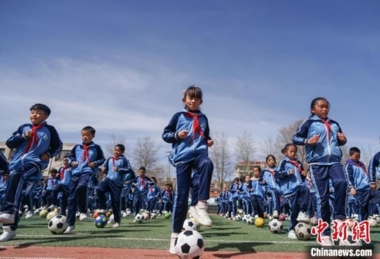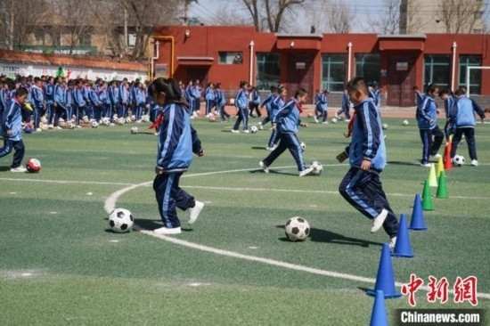 圖為在西寧市大堡子小學,學生進行足球特色大課間展示。馬銘言 攝
