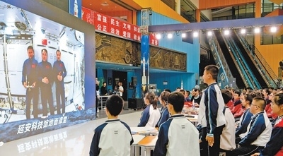 陜西延安科技館“天宮課堂”第四課地面課堂,學(xué)生在向航天員提問。鄧志宏攝(新華社發(fā))