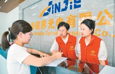 圖為近日,蒙山鎮(zhèn)黨員志愿者來到鏡界光電有限公司宣傳人才政策,指導(dǎo)企業(yè)申報相關(guān)人才項目。
