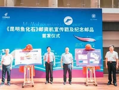 2023年5月,《昆明魚化石》郵資機宣傳戳及系列紀念郵品在西北大學博物館首發(fā)。此次啟用的《昆明魚化石》郵資機宣傳戳,是以中國科學院院士、西北大學教授舒德干團隊發(fā)現(xiàn)的鳳姣昆明魚化石為原型設(shè)計制作。鳳姣昆明魚距今已5.18億年,是已知最古老的脊椎動物。該魚的發(fā)現(xiàn),為揭示寒武紀大爆發(fā)奧秘、破解遠古生命演化謎團提供了獨特的劃時代里程碑證據(jù)。圖為首發(fā)儀式現(xiàn)場。中新社發(fā)
