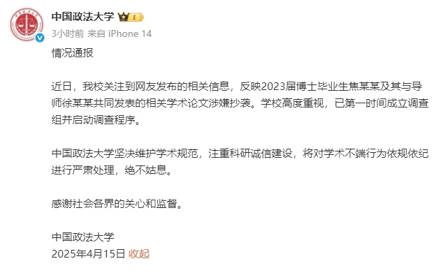 人民網(wǎng)北京4月15日電 (記者孫競)今天上午,中國政法大學(xué)發(fā)布情況通報(bào)稱,該校關(guān)注到網(wǎng)友發(fā)布的相關(guān)信息,反映2023屆博士畢業(yè)生焦某某及其與導(dǎo)師徐某某共同發(fā)表的相關(guān)學(xué)術(shù)論文涉嫌抄襲。學(xué)校高度重視,已第一時(shí)間成立調(diào)查組并啟動(dòng)調(diào)查程序。