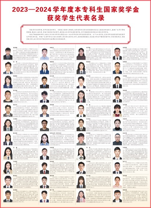 經(jīng)過嚴(yán)格選拔和評審,全國12萬名本專科學(xué)生榮獲2023—2024學(xué)年度本專科生國家獎學(xué)金。以下100名學(xué)生,是本專科生國家獎學(xué)金獲獎學(xué)生中的優(yōu)秀代表。希望廣大青年學(xué)生以他們?yōu)榘駱樱庐?dāng)排頭兵和生力軍,在推進(jìn)強(qiáng)國建設(shè)、民族復(fù)興偉業(yè)中展現(xiàn)青春作為、彰顯青春風(fēng)采、貢獻(xiàn)青春力量,奮力書寫為中國式現(xiàn)代化挺膺擔(dān)當(dāng)?shù)那啻浩隆?/p>