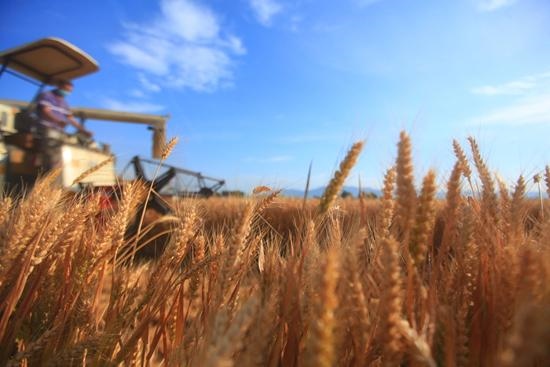 收割機(jī)在山東省臨沂市平邑縣的麥田里收割小麥(6月8日攝)。武紀(jì)全/攝(新華社發(fā))