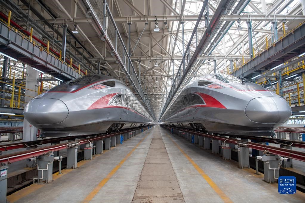 6月19日,鄭渝高鐵全線開(kāi)通運(yùn)營(yíng)重慶首發(fā)列車(chē)CR400AF復(fù)興號(hào)動(dòng)車(chē)組(左)在重慶車(chē)輛段西動(dòng)車(chē)所亮相。新華社記者 唐奕 攝