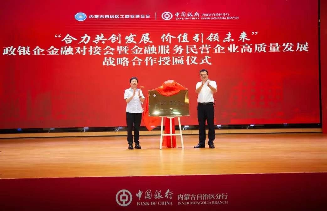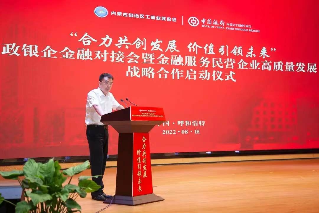 8月18日,中國銀行內蒙古自治區(qū)分行與內蒙古自治區(qū)工商業(yè)聯合會“合力共創(chuàng)發(fā)展 價值引領未來”政銀企金融對接會暨金融服務民營企業(yè)高質量發(fā)展戰(zhàn)略合作啟動儀式在呼和浩特舉行。自治區(qū)政協副主席、工商業(yè)聯合會主席安潤生,自治區(qū)工商業(yè)聯合會提名副主席溫殿龍,中國銀行內蒙古自治區(qū)分行黨委書記、行長胡文勇,中國銀行內蒙古自治區(qū)分行黨委委員、副行長雲雯妍出席活動。自治區(qū)工商業(yè)聯合會相關部門以及行業(yè)協會、商會、企業(yè)代表,中國銀行內蒙古自治區(qū)分行相關部門及直屬支行負責人參加活動。