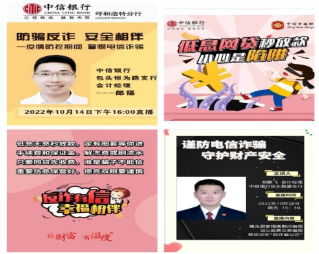 疫情期間,中信銀行呼和浩特分行各經(jīng)營(yíng)機(jī)構(gòu)積極開展線上反詐宣傳,通過朋友圈、公眾號(hào)及線上直播活動(dòng)積極開展金融反詐宣傳,切實(shí)提升金融客戶識(shí)別詐騙手段的能力和防范金融風(fēng)險(xiǎn)的意識(shí)。