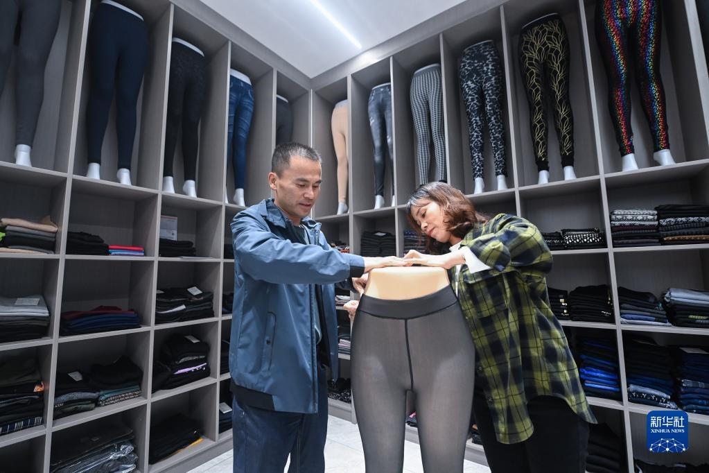 10月27日,在浙江省諸暨市大唐街道的一家專業(yè)生產拉絨打底褲產品的企業(yè)展廳內,工作人員給展示道具套上一款拉絨打底褲。新華社記者 徐昱 攝