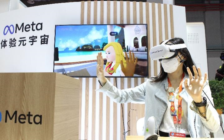 11月7日,在第五屆進博會技術裝備展區(qū)的人工智能專區(qū),一名媒體工作人員借助VR頭戴設備體驗虛擬工作空間“元宇宙”交互應用。新華社記者 侯俊 攝