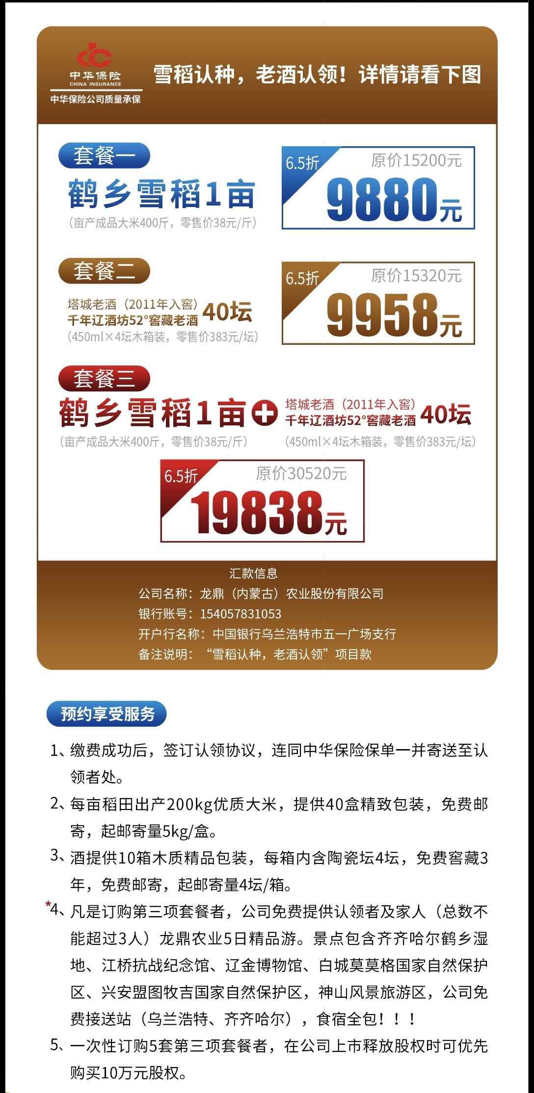 目前,“雪稻認(rèn)種、老酒認(rèn)領(lǐng)”共有三種認(rèn)領(lǐng)套餐(如圖),認(rèn)領(lǐng)第三種套餐,全家可享有龍鼎農(nóng)業(yè)5日深度精品游,景點(diǎn)包含齊齊哈爾鶴鄉(xiāng)濕地、江橋抗戰(zhàn)紀(jì)念館、遼金博物館、白城莫莫格國家自然保護(hù)區(qū)、興安盟圖牧吉國家自然保護(hù)區(qū)、神山風(fēng)景旅游區(qū),公司免費(fèi)接送站(烏蘭浩特、齊齊哈爾) ,食宿全包。