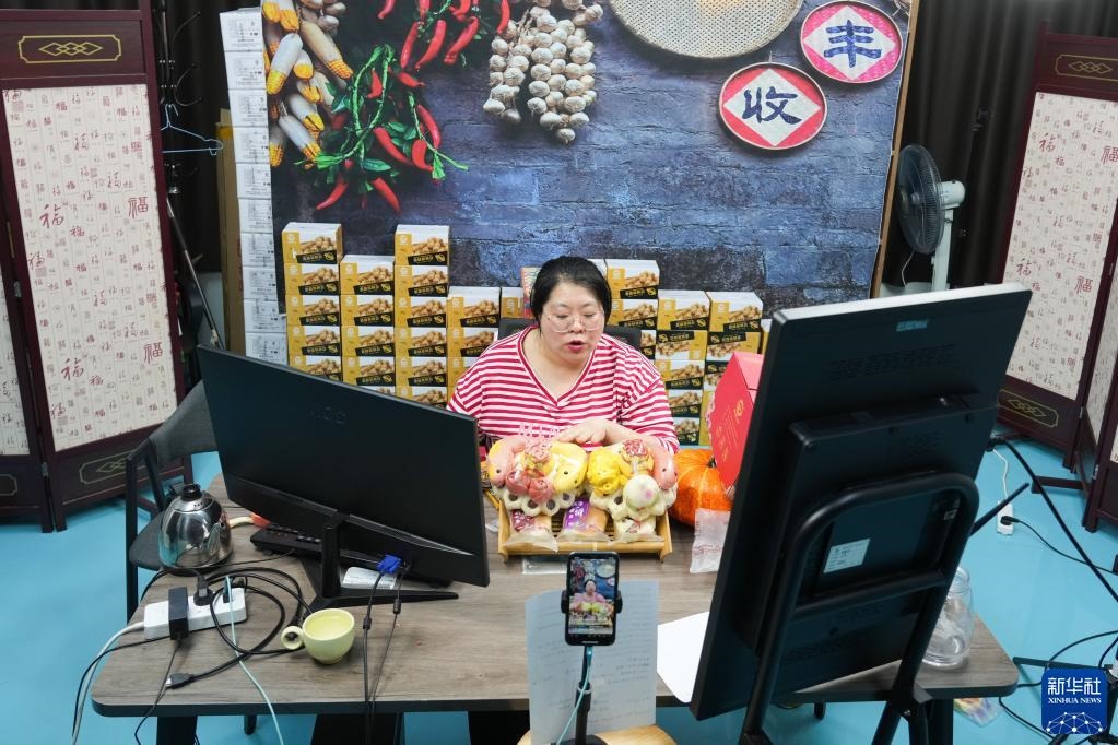2月17日,威海長(zhǎng)林生態(tài)農(nóng)業(yè)有限公司員工直播銷(xiāo)售花餑餑產(chǎn)品。新華社記者 朱崢 攝