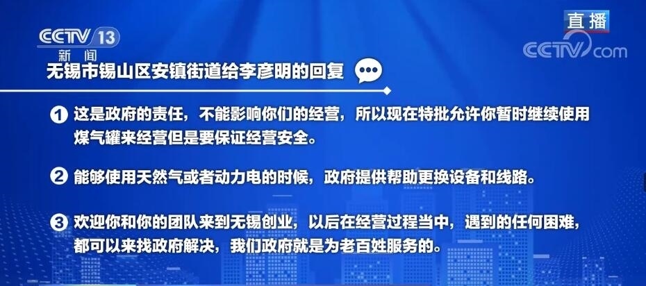 白巖松:首先我們來看看安鎮(zhèn)街道給李彥明的回復(fù)當(dāng)中的一些關(guān)鍵詞,第一個,這是政府的責(zé)任,不能影響你們的經(jīng)營。第二個里頭包括能夠使用天然氣或者動力電的時候,政府提供幫助更換設(shè)備和線路。在第三里頭有我們政府就是為老百姓服務(wù)的。咱們接下來馬上連線一下當(dāng)事人,無錫市錫山區(qū)安鎮(zhèn)街道商務(wù)科的科長鄒祎,就是他幫著辦的這個事情。鄒科長您好!您當(dāng)然感受得到您火了,在網(wǎng)上也被網(wǎng)友表揚,我特別想知道您的領(lǐng)導(dǎo)表揚您沒有?