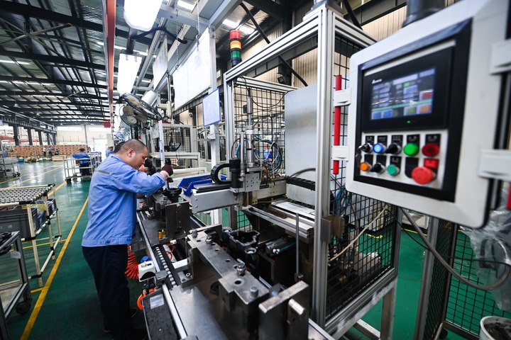 2022年9月27日,在位于浙江省諸暨市店口鎮(zhèn)工業(yè)區(qū)的浙江萬安科技股份有限公司數(shù)字化車間內(nèi),工人在流水線上生產(chǎn)作業(yè)。新華社記者 徐昱 攝
