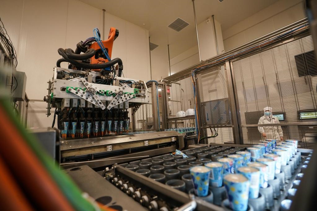 位于江蘇蘇州太倉(cāng)的聯(lián)合利華和路雪生產(chǎn)基地,于2021年9月獲評(píng)全球“燈塔工廠(chǎng)”,成為當(dāng)?shù)亍爸悄苤圃臁钡臉?biāo)桿。工廠(chǎng)里,機(jī)器人正將產(chǎn)品轉(zhuǎn)移到速凍隧道。新華社記者 季春鵬 攝
