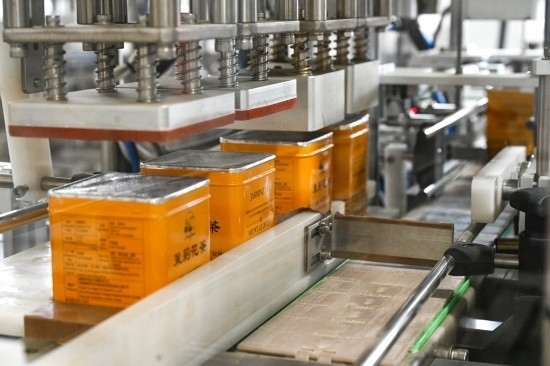 在位于福州市的福建茶葉進(jìn)出口有限責(zé)任公司福興茶葉加工廠流水線上拍攝的罐裝的茉莉花茶(2023年4月11日攝)。新華社記者 周義 攝